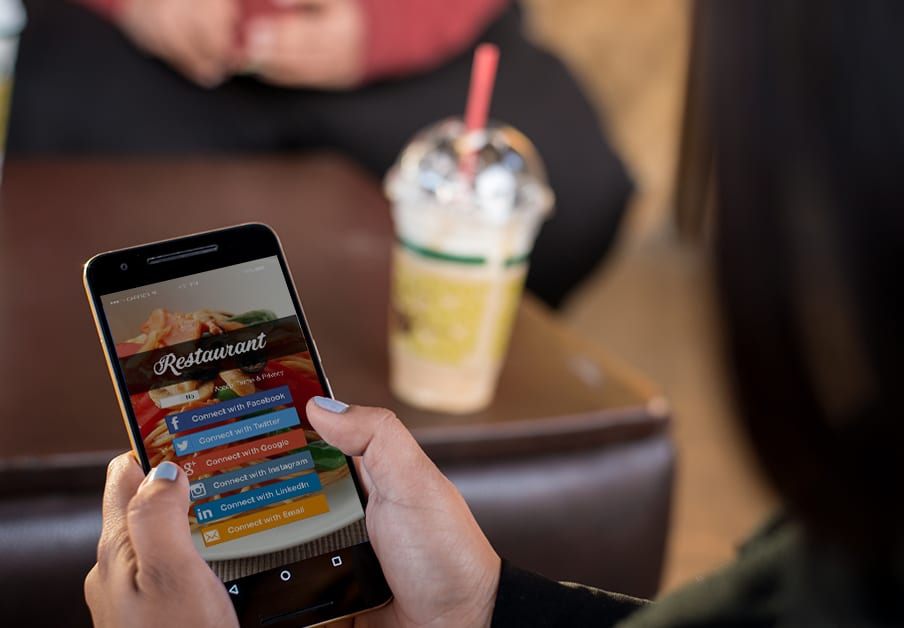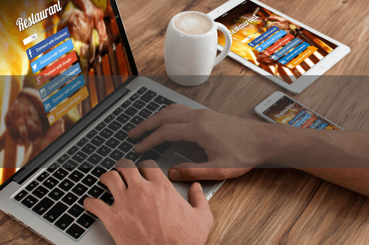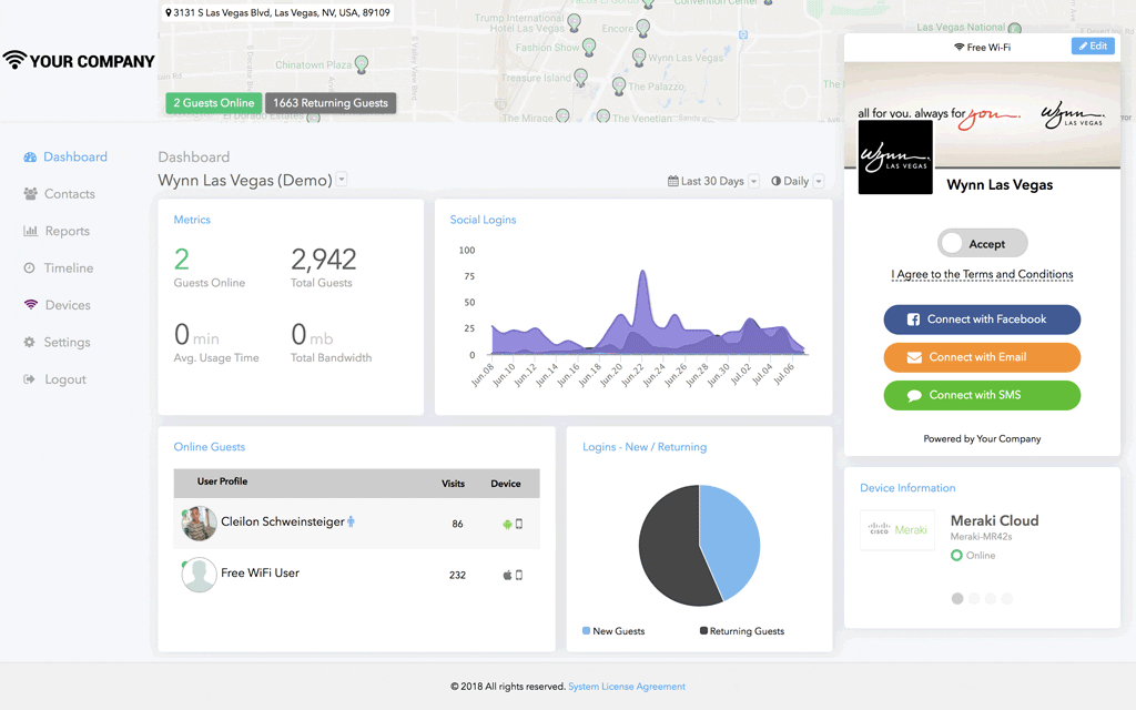 Your customer will be directed to a landing page that is branded to your establishment, asking them to log-in with their Facebook, Twitter, LinkedIn, Google, Instagram or Email accounts to access your Free Wi-Fi. You decide which login options you’d like to provide.